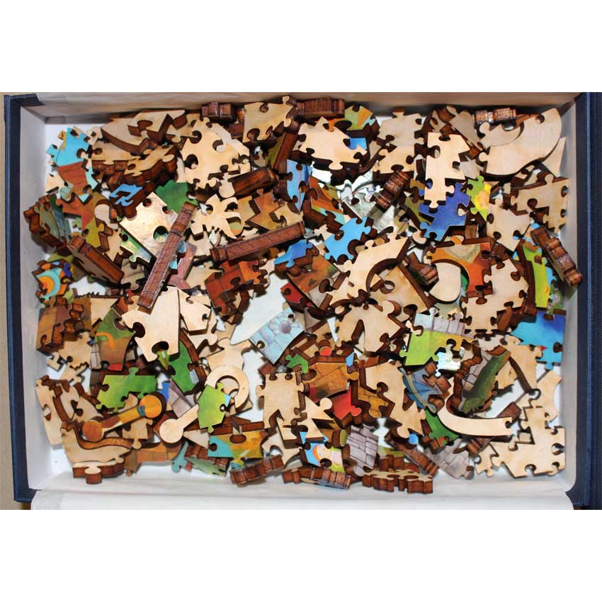 Good – Puzzle has been done a few times and there may be a number of pieces showing wear on their edges.   The wood is in good structural condition, it’s mostly cosmetic issues with the paper layer being worn.