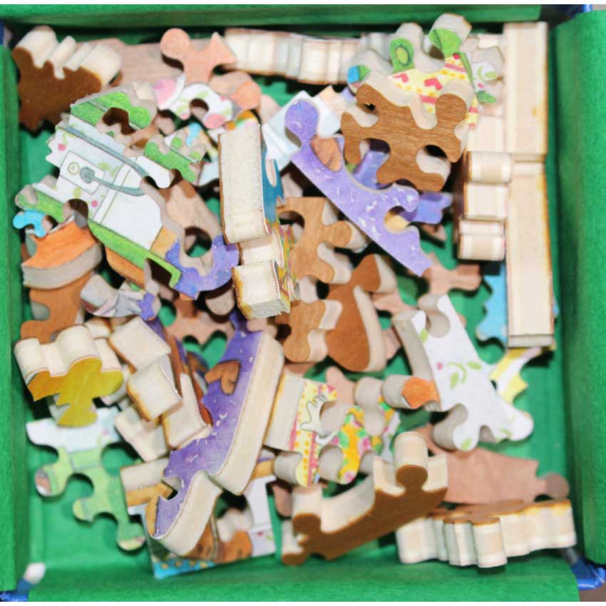 Good – Puzzle has been done a few times and there may be a number of pieces showing wear on their edges.   The wood is in good structural condition, it’s mostly cosmetic issues with the paper layer being worn.