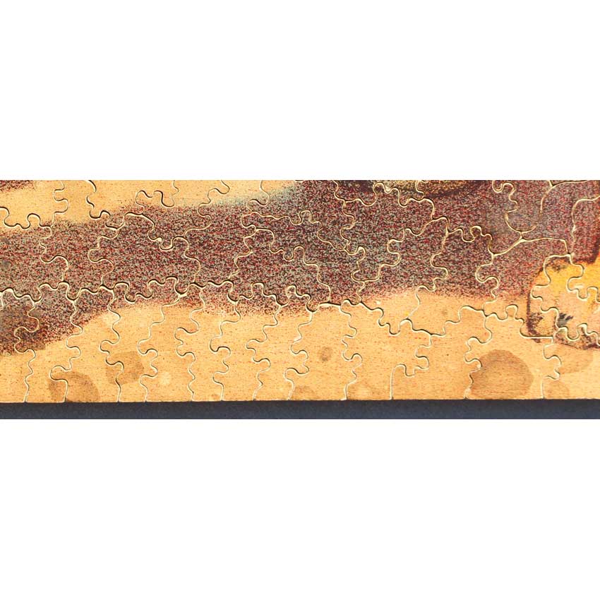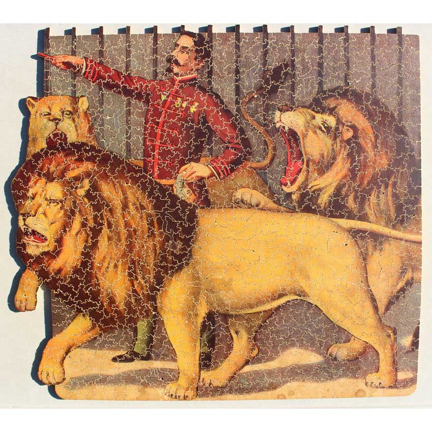 Good – Puzzle has been done a few times and there may be a number of pieces showing wear on their edges.   The wood is in good structural condition, it’s mostly cosmetic issues with the paper layer being worn.