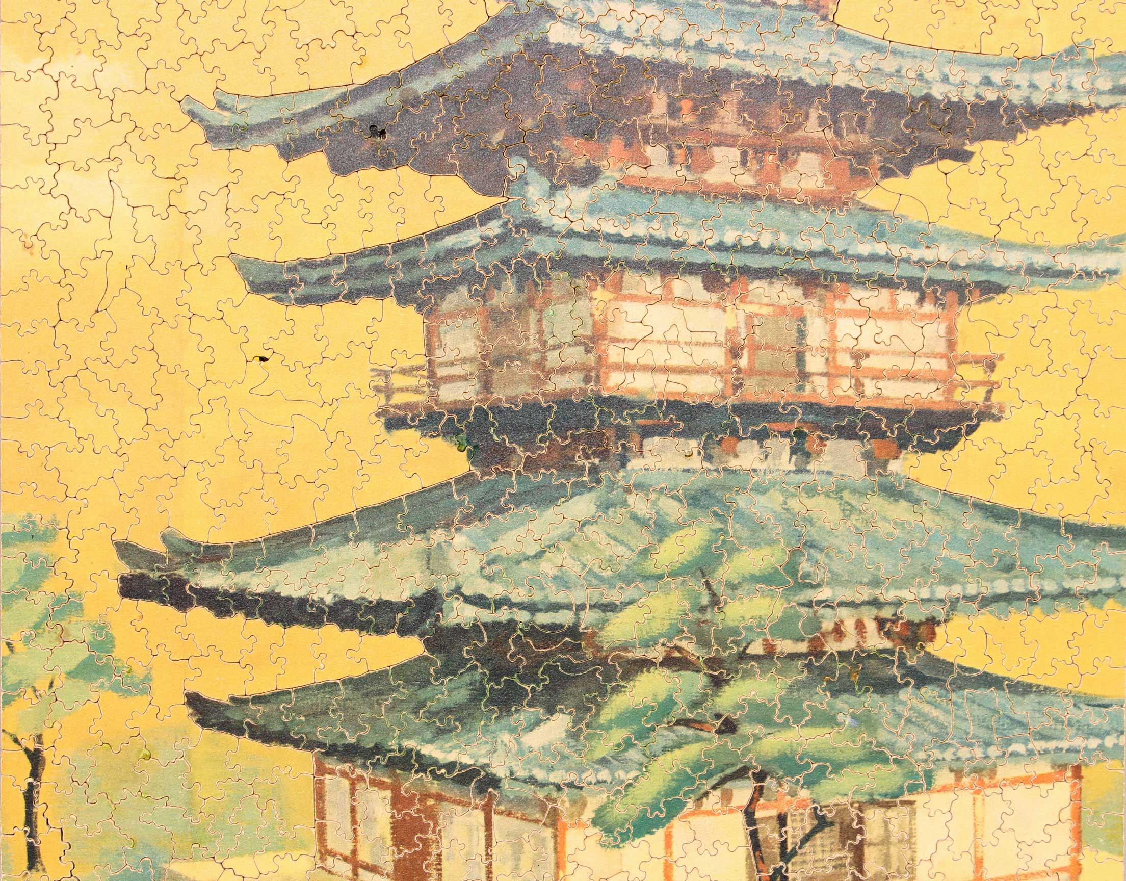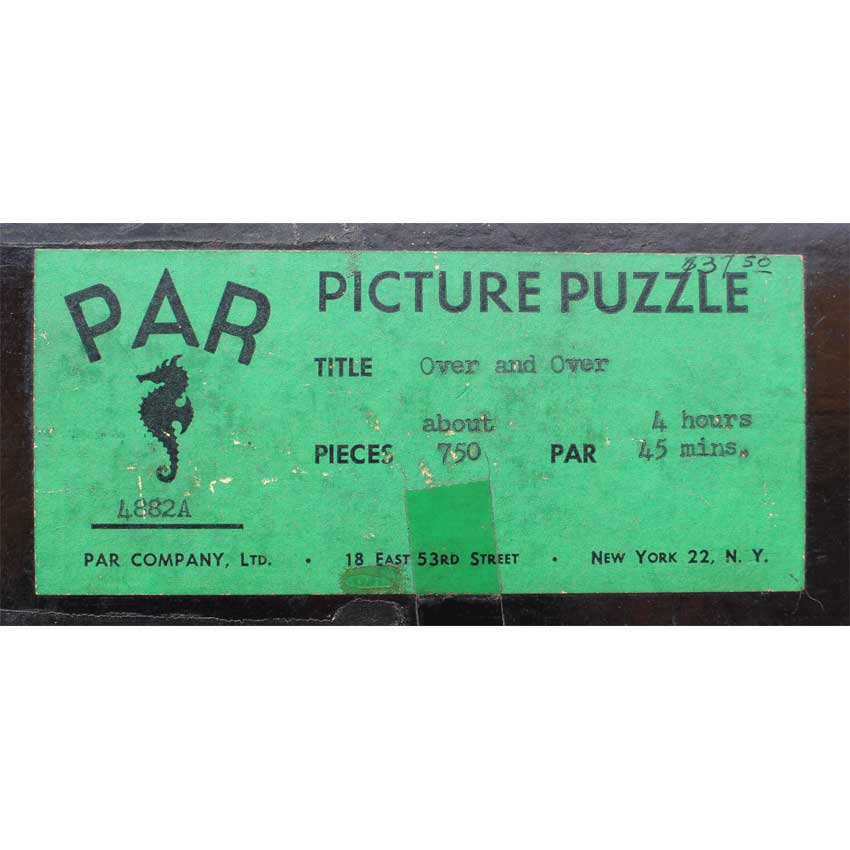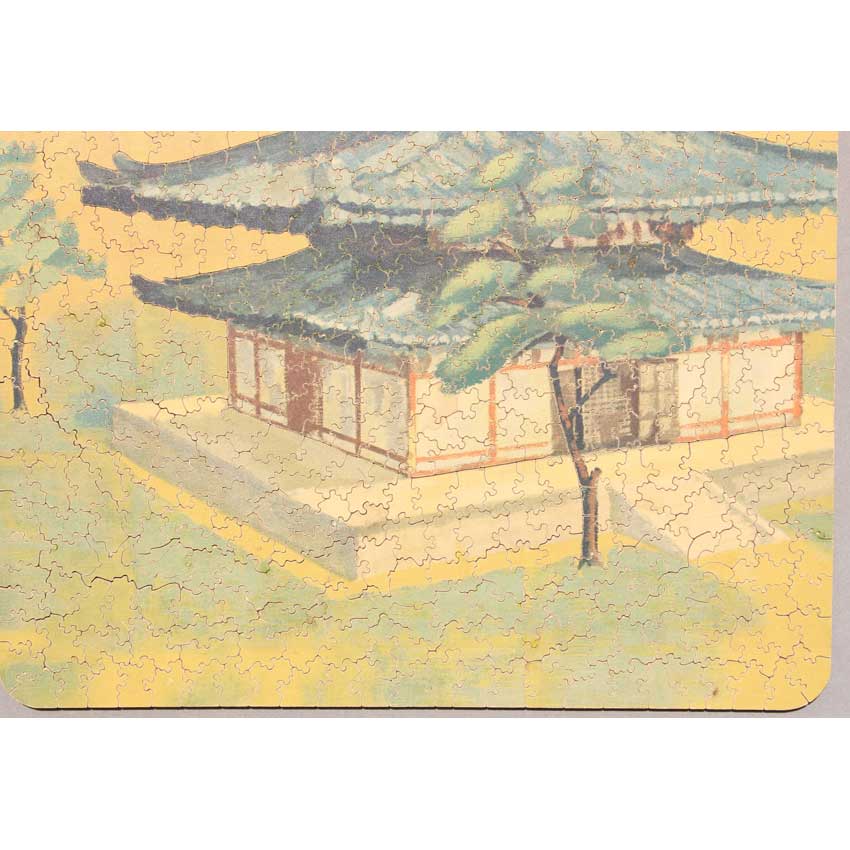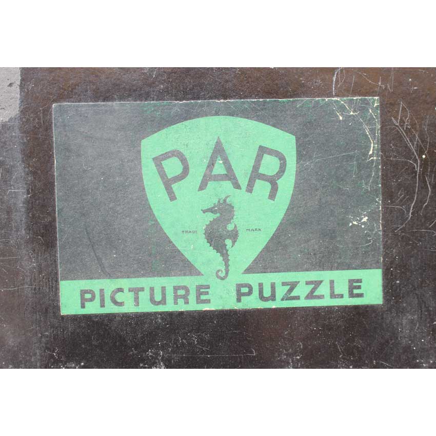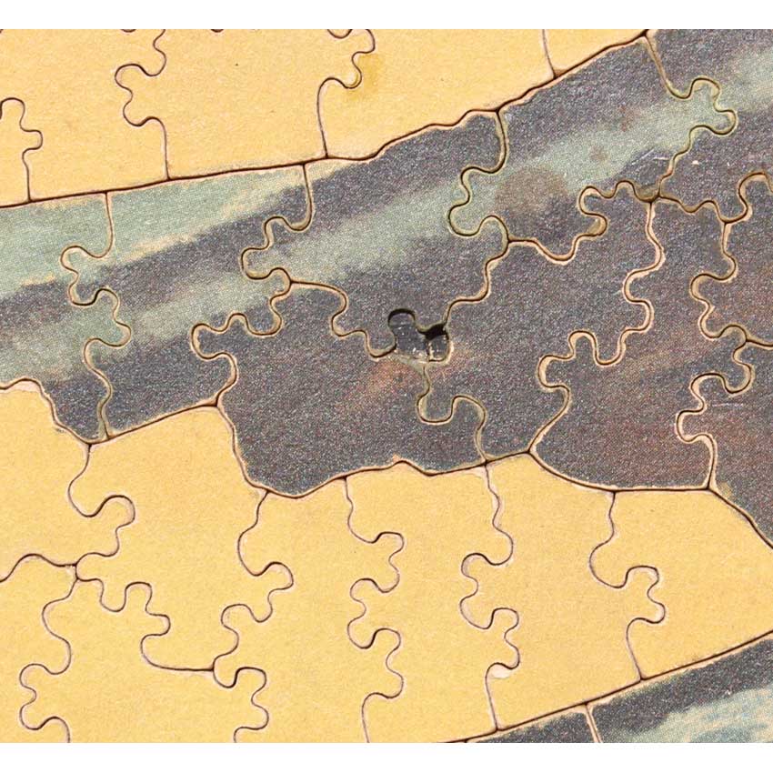 Good – Puzzle has been done a few times and there may be a number of pieces showing wear on their edges. The wood is in good structural condition, it’s mostly cosmetic issues with the paper layer being worn.