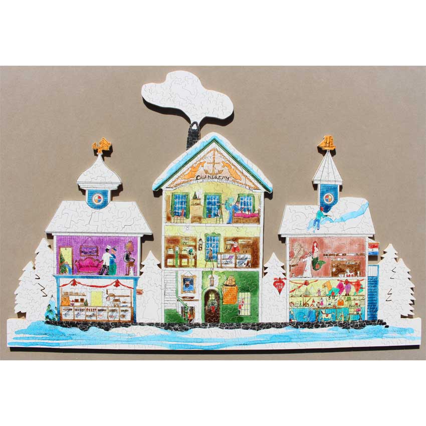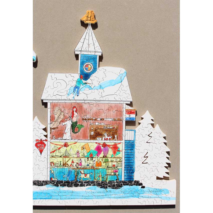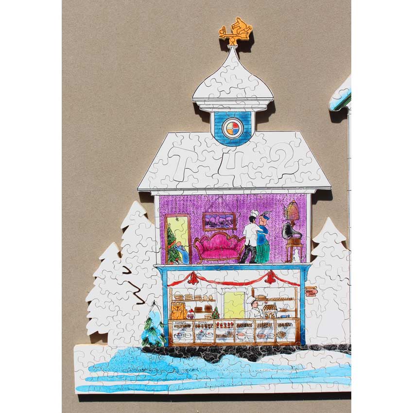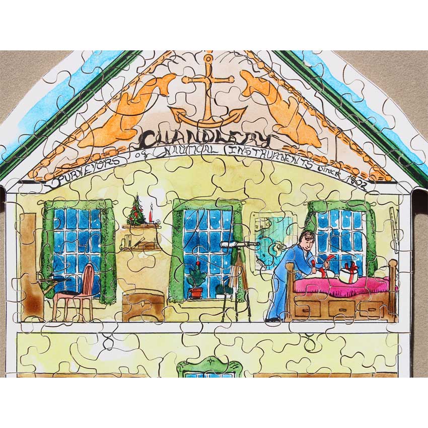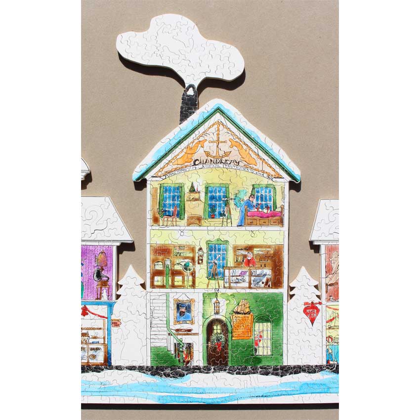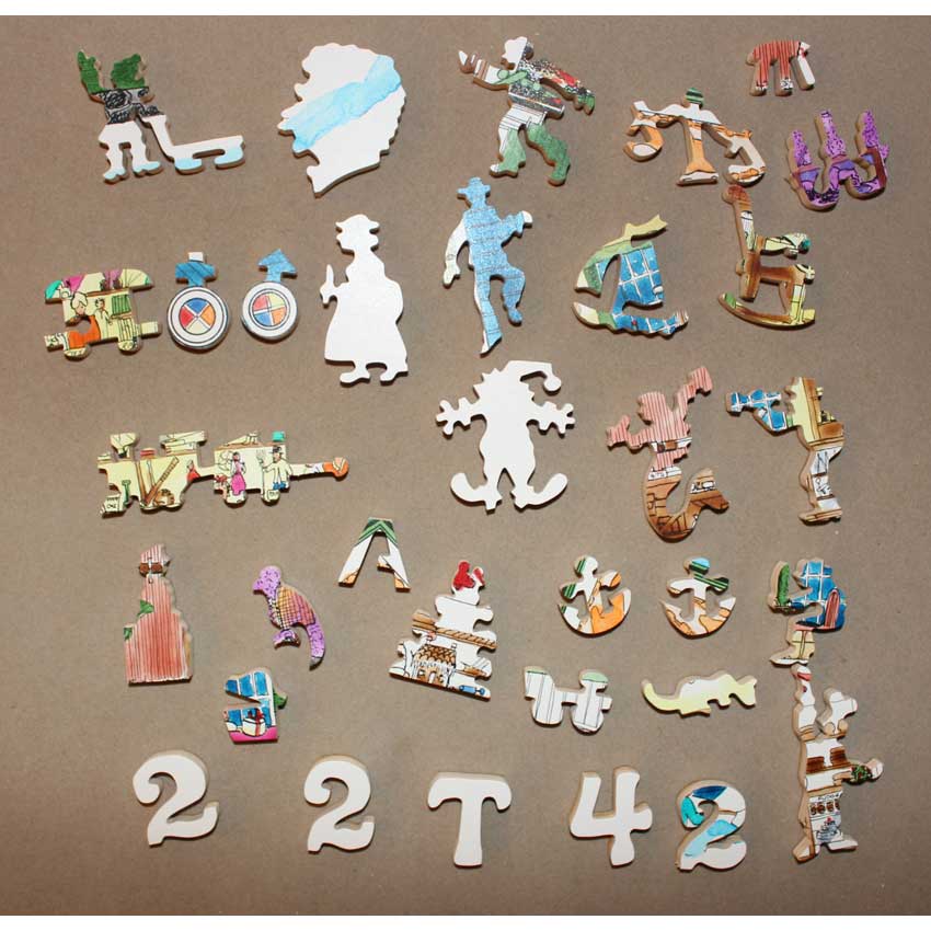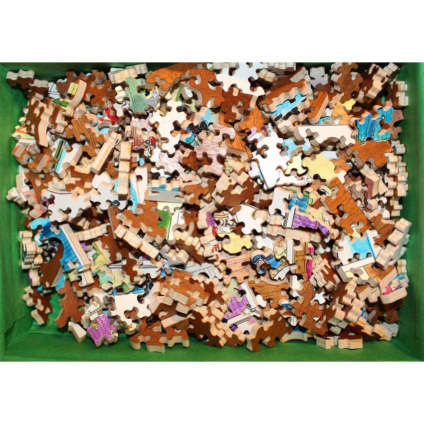 Good – Puzzle has been done a few times and there may be a number of pieces showing wear on their edges. The wood is in good structural condition, it’s mostly cosmetic issues with the paper layer being worn.