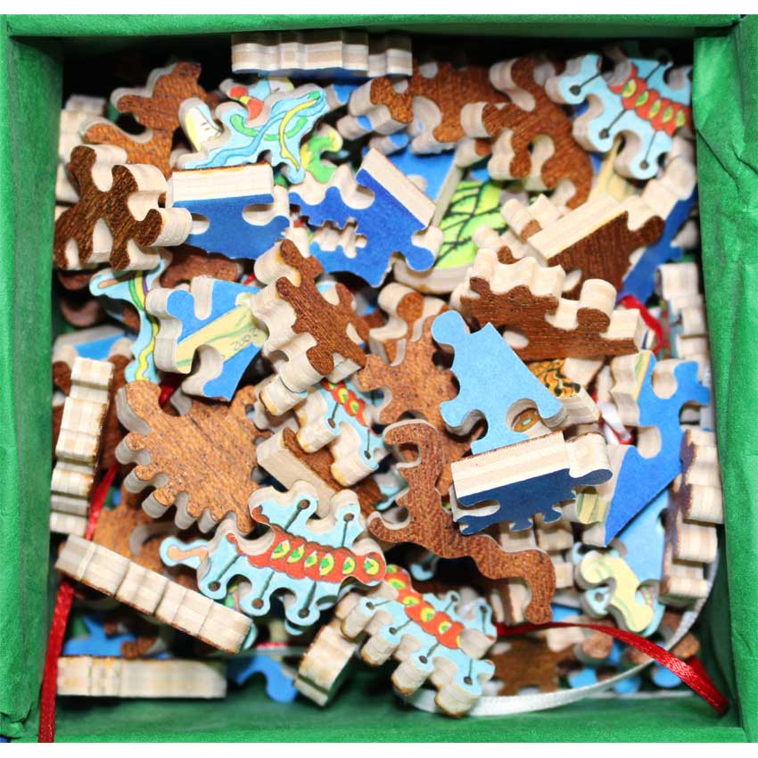 Good – Puzzle has been done a few times and there may be a number of pieces showing wear on their edges. The wood is in good structural condition, it’s mostly cosmetic issues with the paper layer being worn.