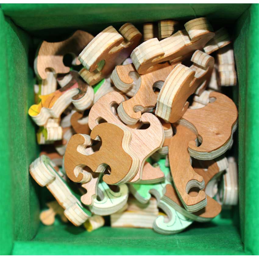 Good – Puzzle has been done a few times and there may be a number of pieces showing wear on their edges.   The wood is in good structural condition, it’s mostly cosmetic issues with the paper layer being worn.