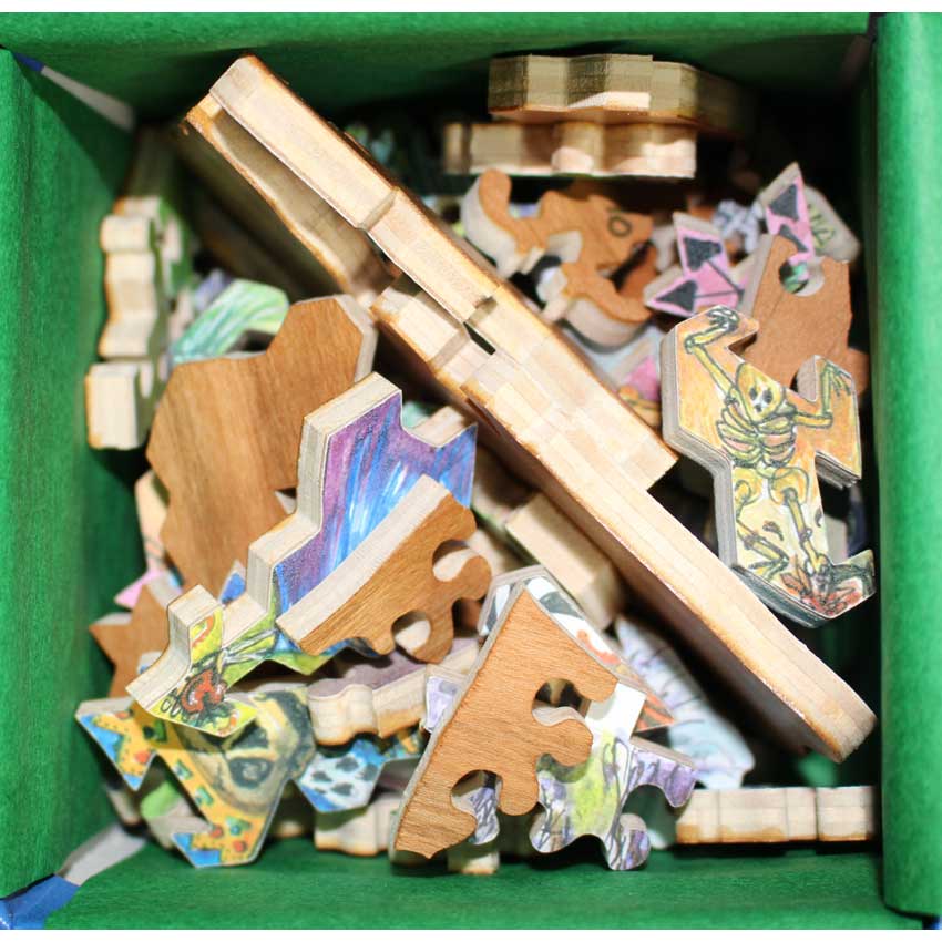Good – Puzzle has been done a few times and there may be a number of pieces showing wear on their edges. The wood is in good structural condition, it’s mostly cosmetic issues with the paper layer being worn.