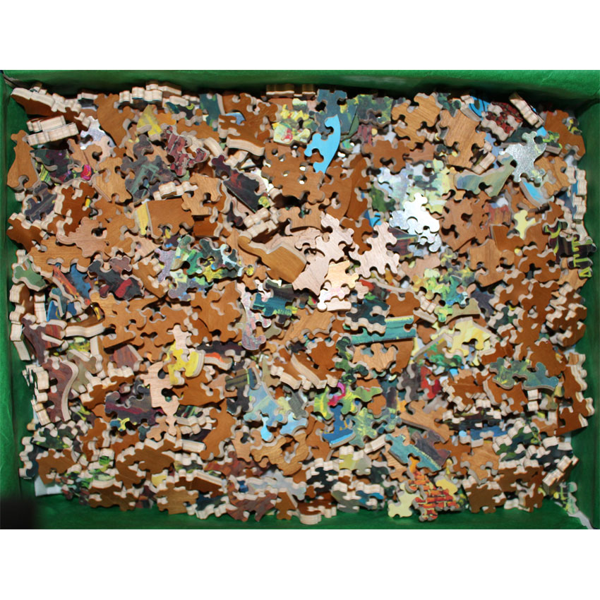 Good – Puzzle has been done a few times and there may be a number of pieces showing wear on their edges. The wood is in good structural condition, it’s mostly cosmetic issues with the paper layer being worn.