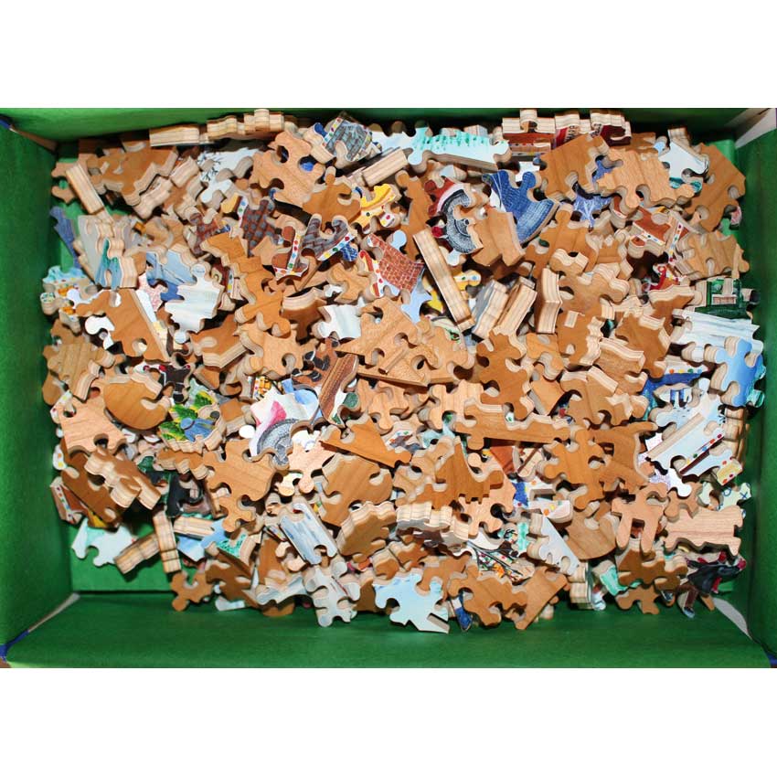 Good – Puzzle has been done a few times and there may be a number of pieces showing wear on their edges.   The wood is in good structural condition, it’s mostly cosmetic issues with the paper layer being worn.