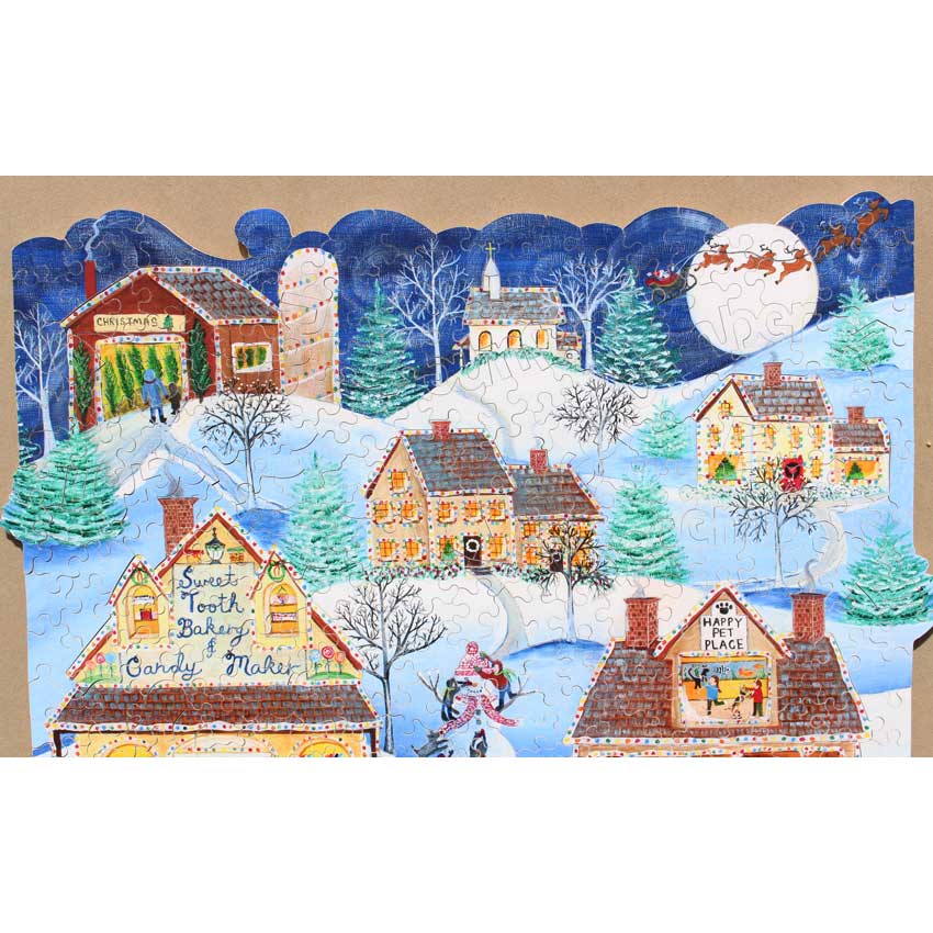 You are looking at a unique twist on the typical holiday puzzles we come across. What really caught our eye is the unusual style of the artist and the interesting juxtaposition of what looks like a scene that could be from the 1920s or 30s but with details that seem to feel a lot more modern as well as the interesting way she painted the decorative lights. A great puzzle for any time of the year!