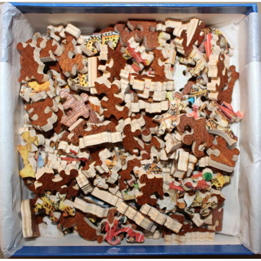 Good – Puzzle has been done a few times and there may be a number of pieces showing wear on their edges.   The wood is in good structural condition, it’s mostly cosmetic issues with the paper layer being worn.