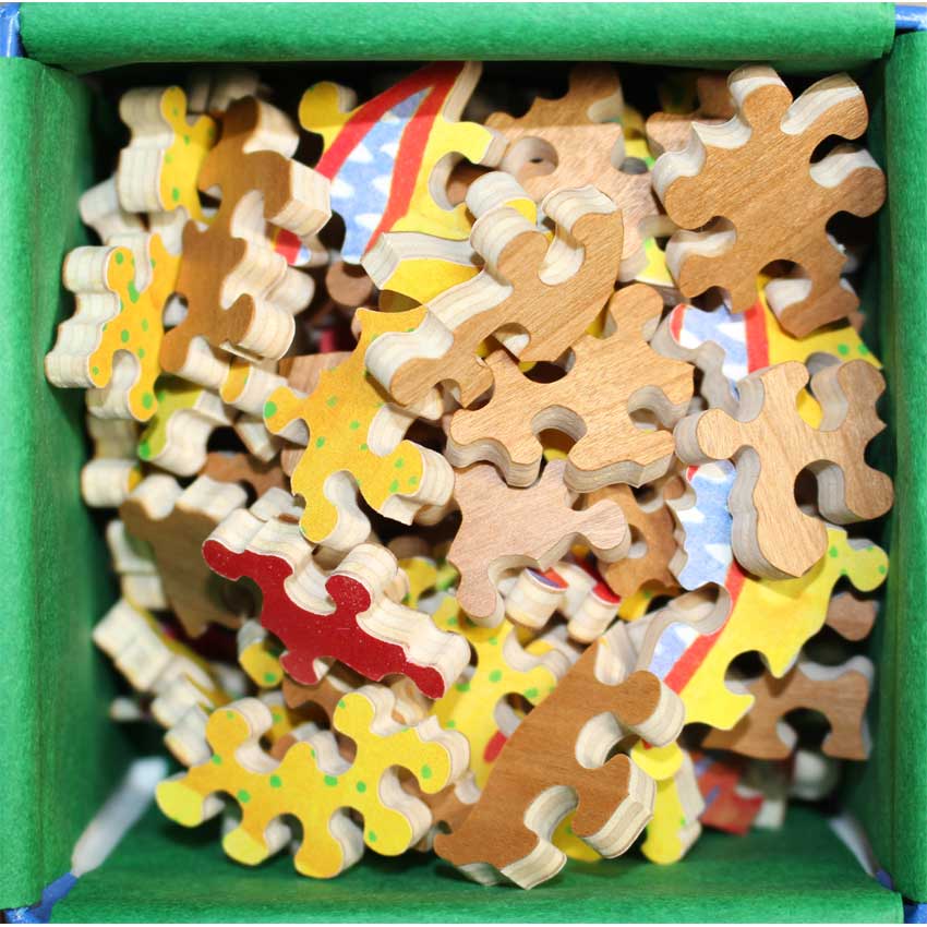 Good – Puzzle has been done a few times and there may be a number of pieces showing wear on their edges. The wood is in good structural condition, it’s mostly cosmetic issues with the paper layer being worn.