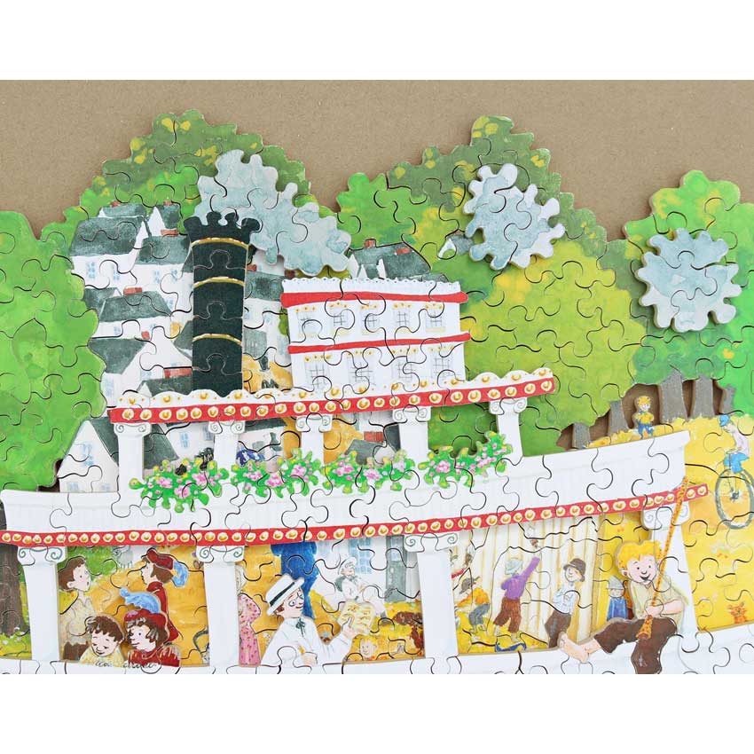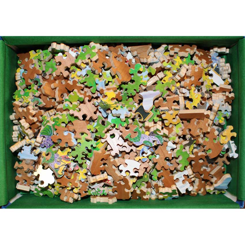 Good – Puzzle has been done a few times and there may be a number of pieces showing wear on their edges.   The wood is in good structural condition, it’s mostly cosmetic issues with the paper layer being worn.