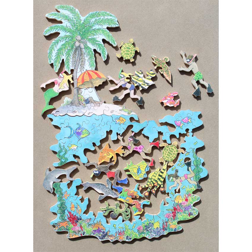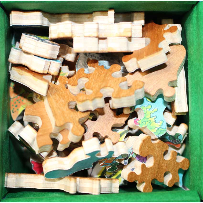 Good – Puzzle has been done a few times and there may be a number of pieces showing wear on their edges. The wood is in good structural condition, it’s mostly cosmetic issues with the paper layer being worn.