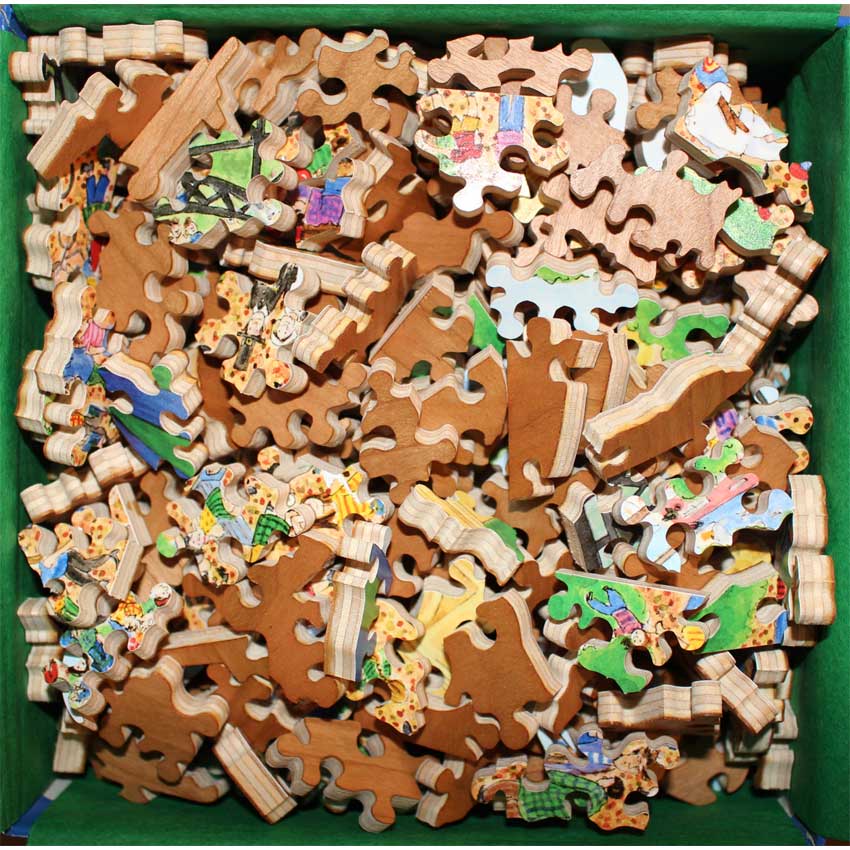 Good – Puzzle has been done a few times and there may be a number of pieces showing wear on their edges.   The wood is in good structural condition, it’s mostly cosmetic issues with the paper layer being worn.
