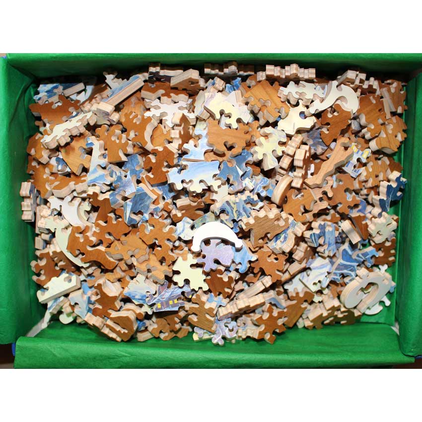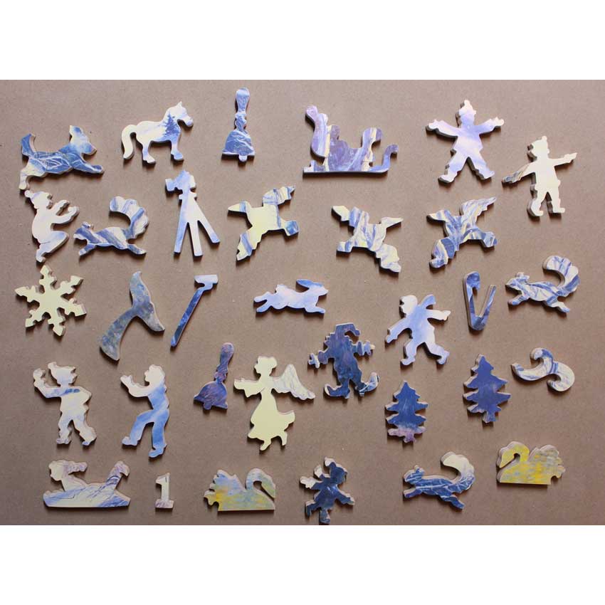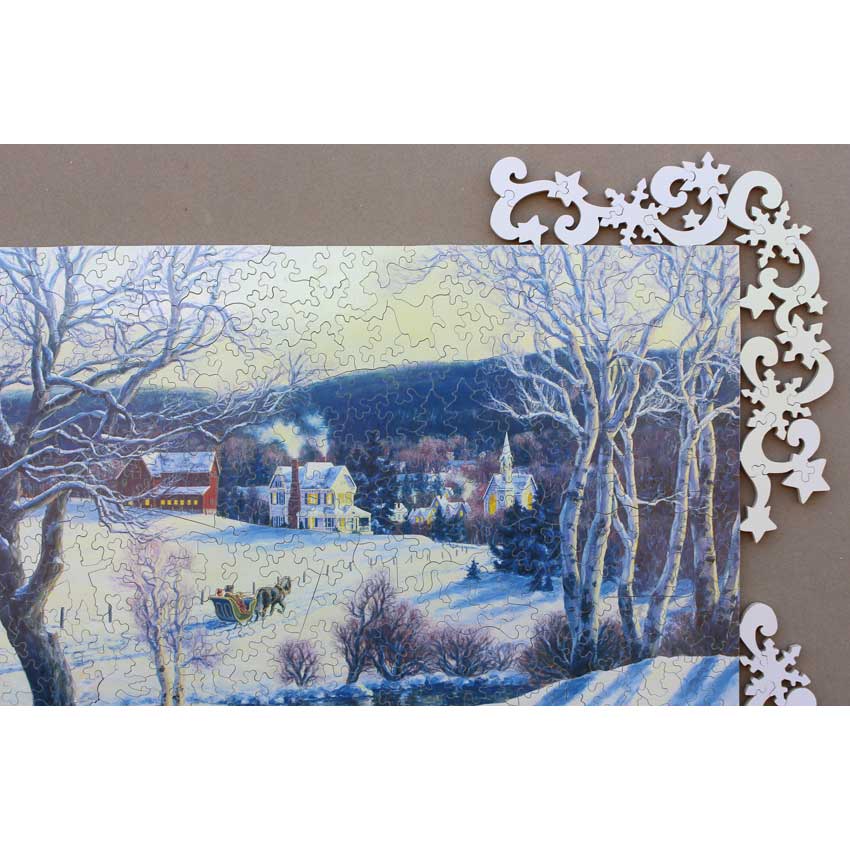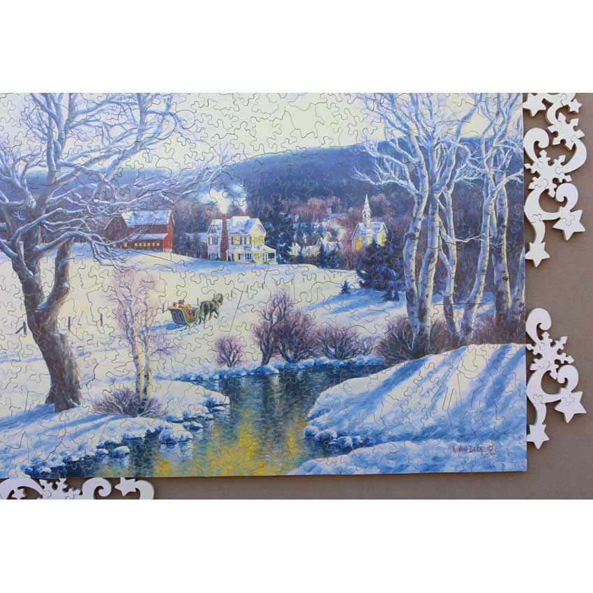 The first thing that grabs you with this puzzle is the great edge design. It’s harder than it looks! What really stands out is the amazing image. It is pretty hard for a puzzle, with a lot of interesting variances in the shades of colors in the winter scene as the sun begins that early sunset. Bonus: Includes original flyer for the puzzle.