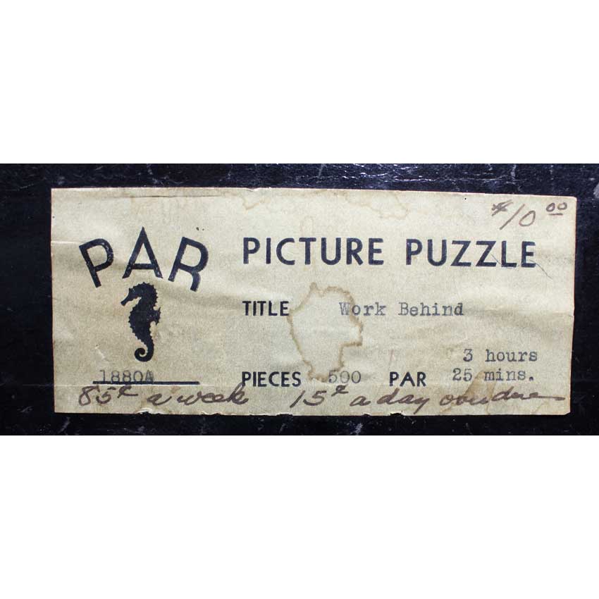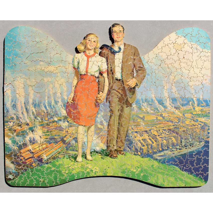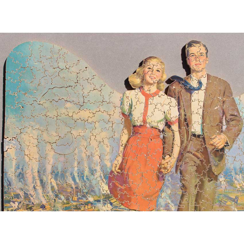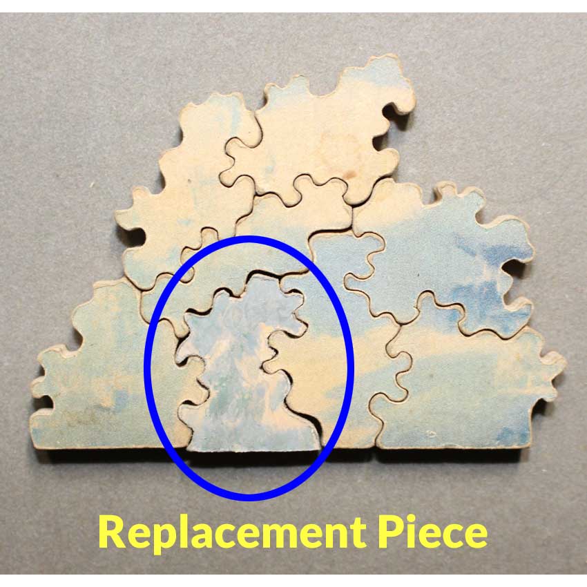 Good – Puzzle has been done a few times and there may be a number of pieces showing wear on their edges. The wood is in good structural condition, it’s mostly cosmetic issues with the paper layer being worn.